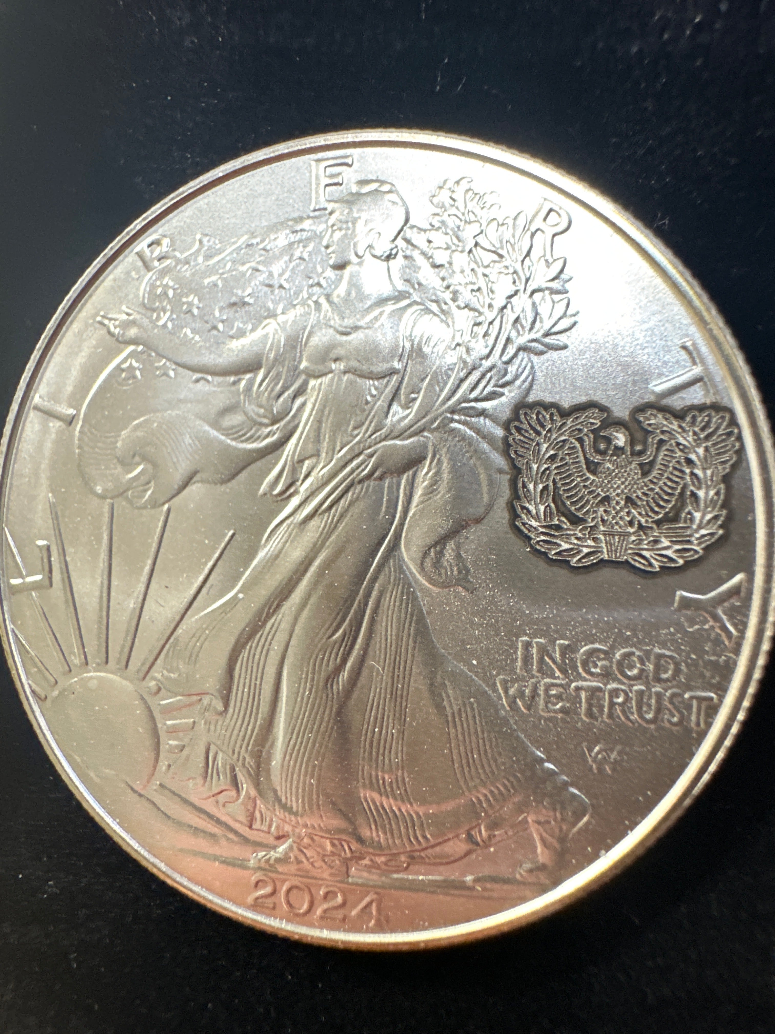 Has the Rising Eagle on the front and the back is inscribed with “First Salute”